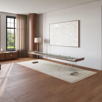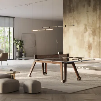 Each creation — from the Filotto glass billiard table and the Lungolinea ping pong table, to the Derby foosball, Unootto poker, and Scivolo shuffleboard — is entirely crafted in Italy and represents the perfect synthesis of transparency, precision, and luxury.